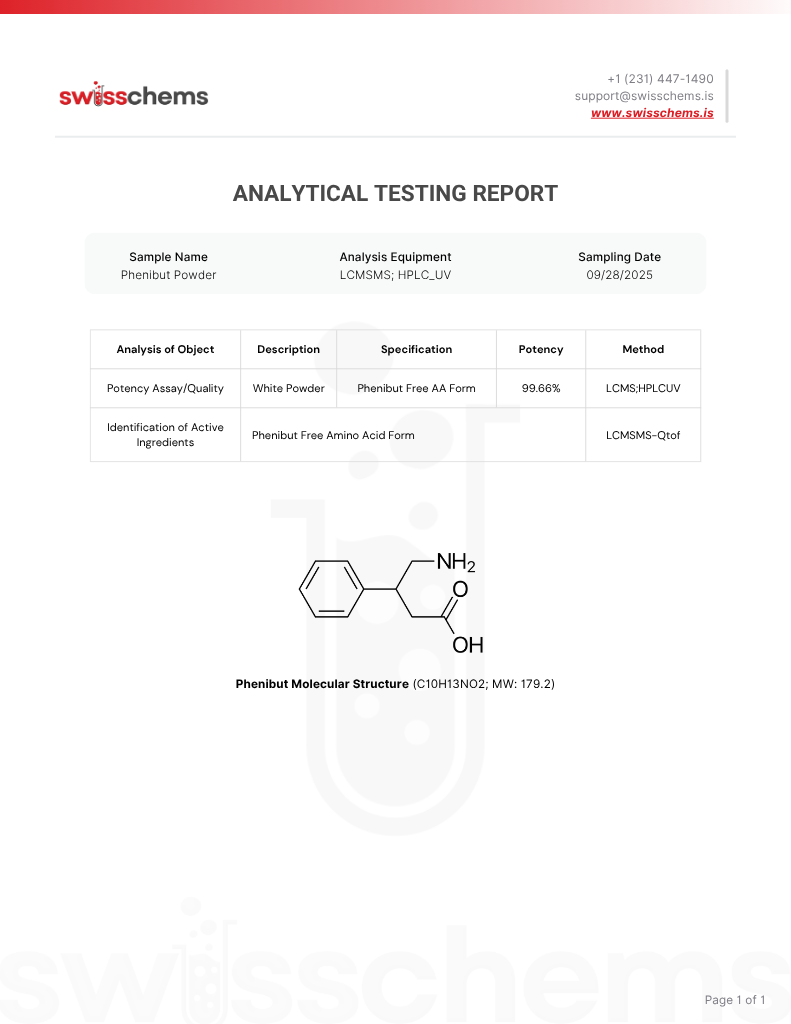 Phenibut HCl (β-phenyl-γ-aminobutyric acid hydrochloride) is a water-soluble GABA derivative with a hydrochloride salt modification, enhancing stability and dissolution in aqueous solutions. It features a phenyl ring substitution, which allows for improved lipophilicity and receptor interaction compared to native GABA. This compound primarily interacts with GABA_B receptors, influencing neurotransmitter modulation and signal transduction. Phenibut HCl undergoes hepatic metabolism through deamination and conjugation, with renal clearance as the primary excretion pathway. The hydrochloride form exhibits higher solubility than its free amino acid counterpart, affecting absorption kinetics and bioavailability.